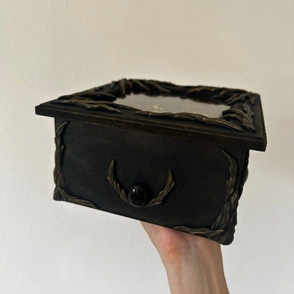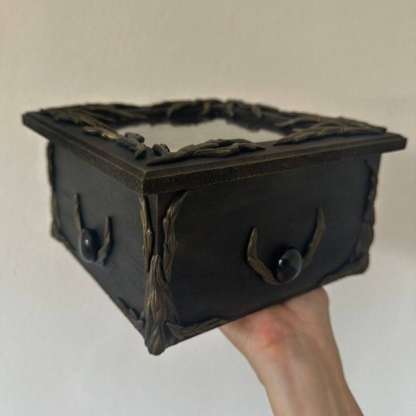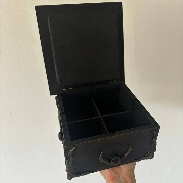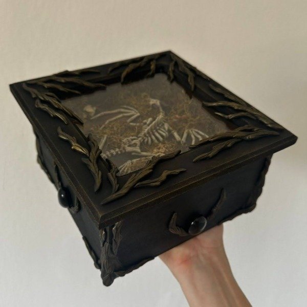 Caja con 4 divisiones, con decoración de esqueleto de dragón. La caja es de MDF de 5mm con bisagras de metal y la decoración está hecha en porcelana fría.