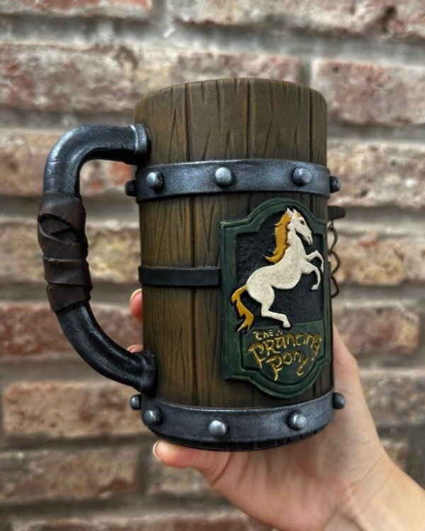 Chopp con diseño inspirado en El Señor de los Anillos, con el logo de la taberna The Prancing Pony.